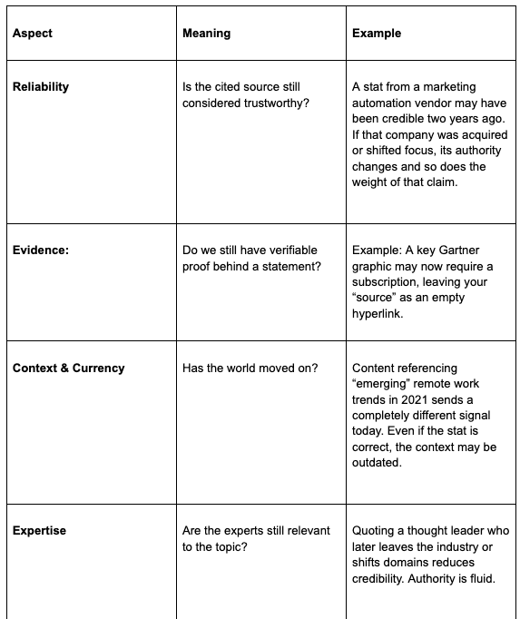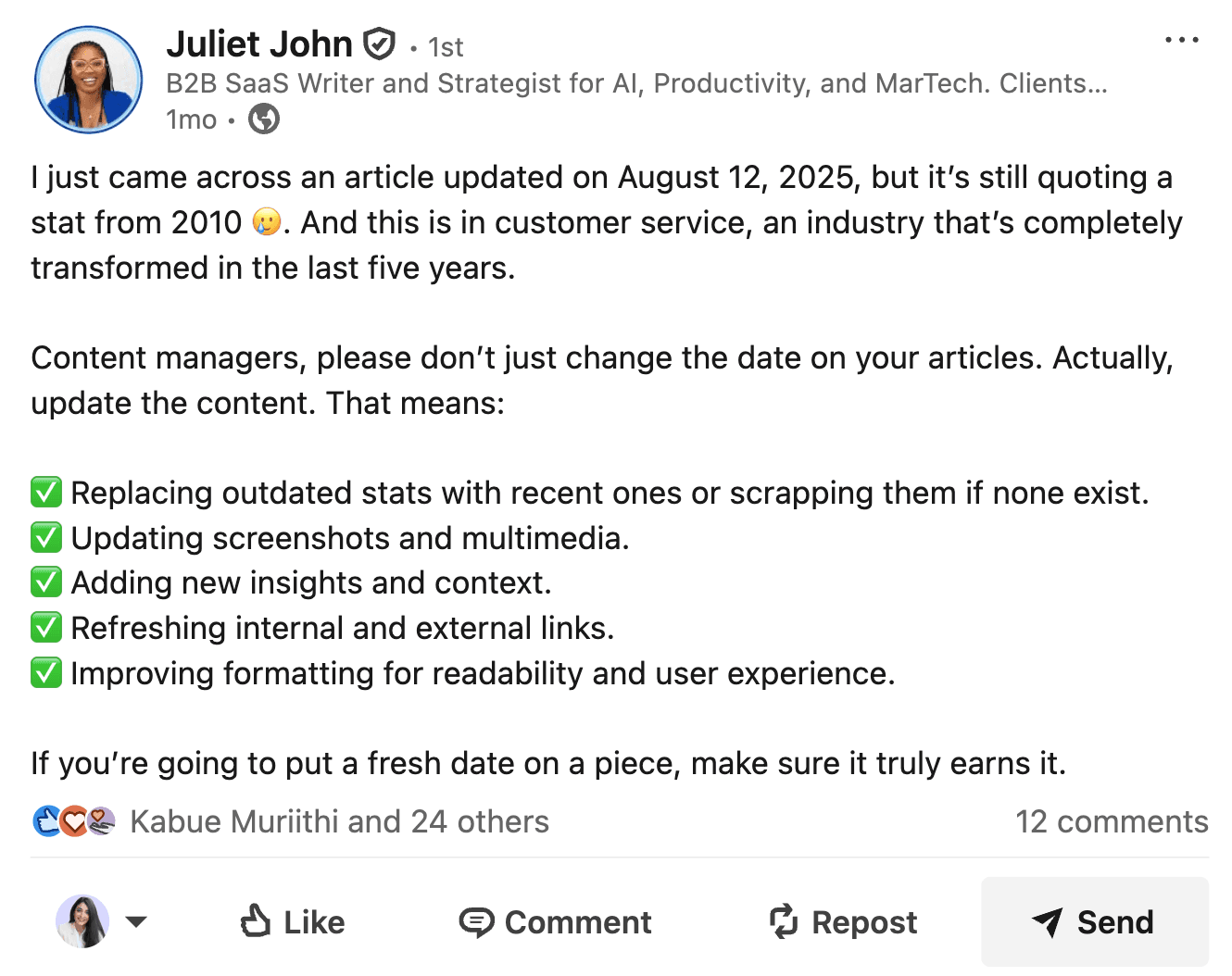 Outdated content creates a rabbit hole of broken trust. When readers spot one outdated fact, they start doubting all the other facts in the piece. They screenshot your old statistics and share them on LinkedIn as examples of lazy content and tell their team to find better sources.