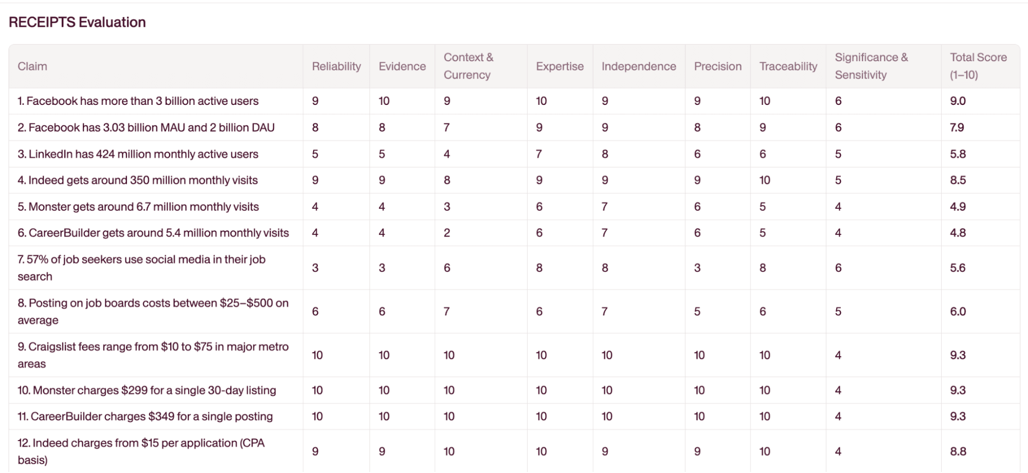 The numbers make risk visible. For example, the Facebook claim scores 9.0 overall with high marks for Evidence and Traceability, which suggests it’s still solid. By contrast, older traffic estimates for Monster and CareerBuilder score under 5, with low Context & Currency and Precision.