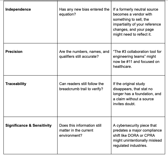 But once you’ve been publishing consistently for a few years, that same process becomes unmanageable. A content library of 300+ pages means thousands of data points, links, and claims that can quietly expire without warning. By the time you discover one outdated reference, dozens more are already eroding trust and rankings.