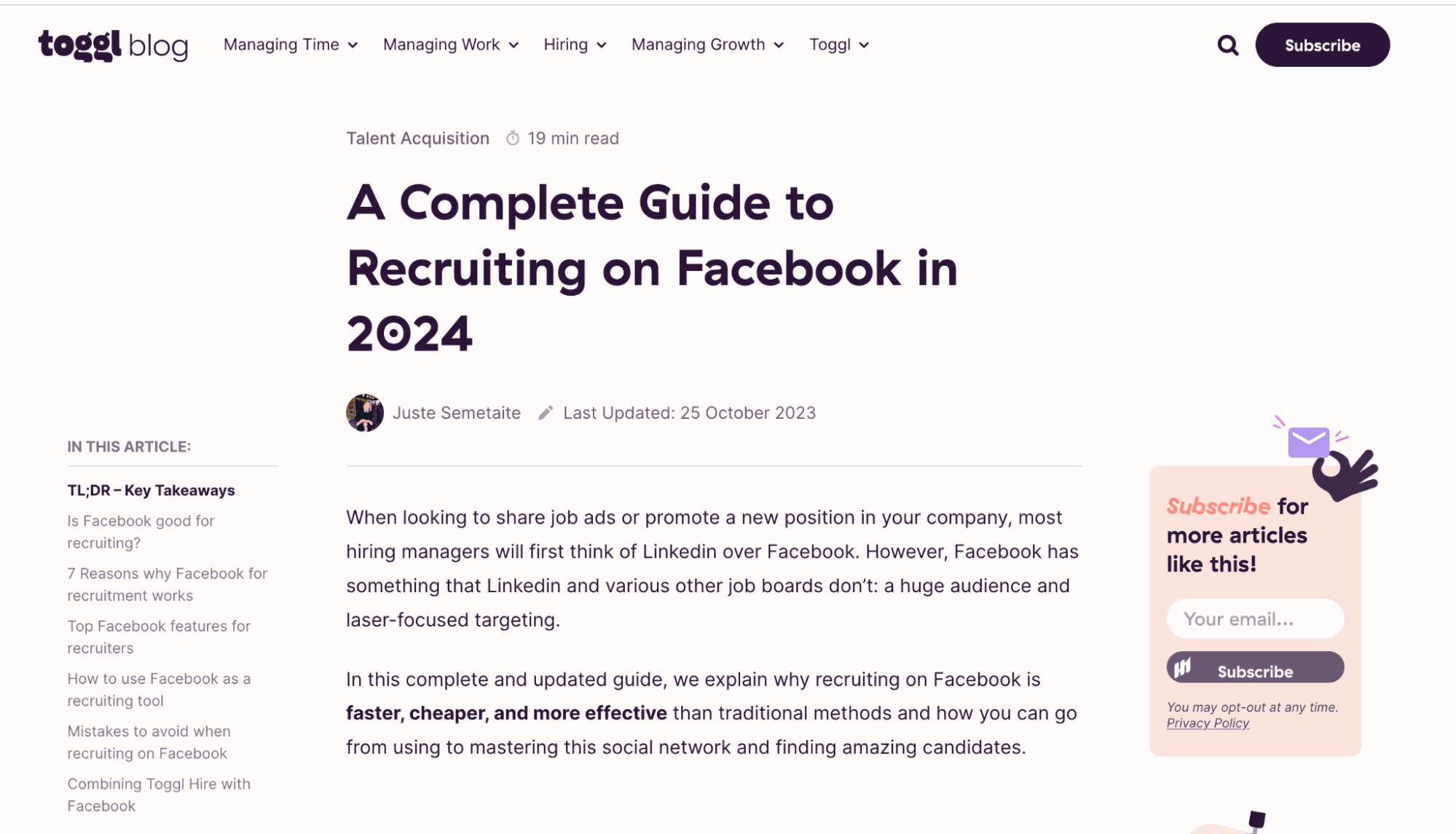 For this preview, I’ve used an article from Toggl on recruiting on Facebook, which was published in 2023 and updated in 2024.