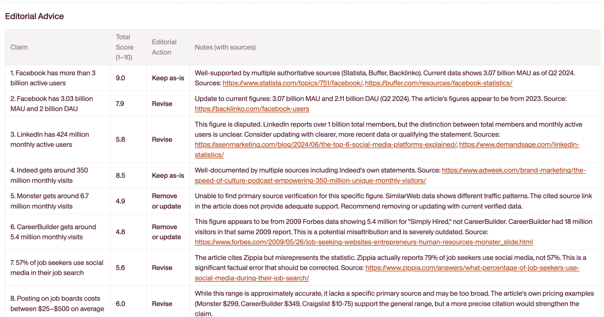 Put simply, the agent gives you: a clean list of checkable facts, a common yardstick to score them, and clear next steps with sources. The two tables are easy to read, easy to sort, and they move you from “we think something’s outdated” to “here are the five edits you need to prioritize and the links to back them up.”