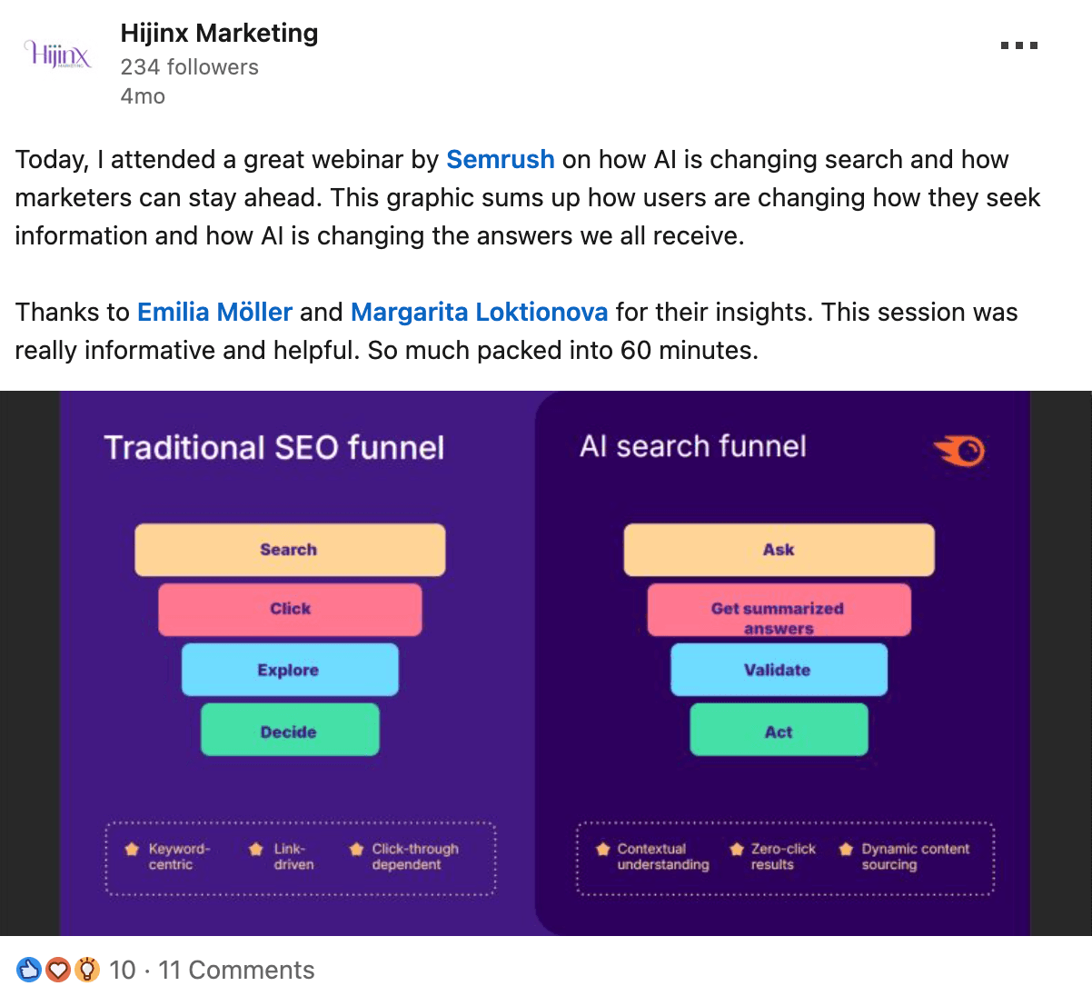 - Post-webinar LinkedIn publications made by attendees, amplifying Semrush’s thought leadership