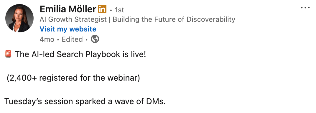 For example, earlier this year, we hosted an AI visibility webinar together with Emilia Moller, a LinkedIn expert.