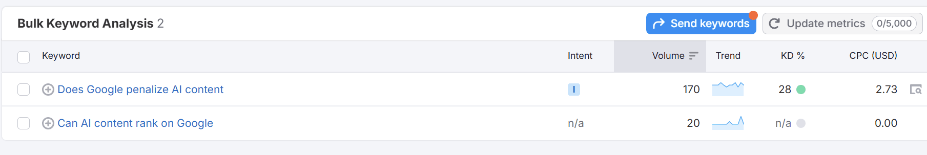 I used Semrush to check whether there was any search volume for related queries — such as “Does Google penalize AI content?” and “Can AI content rank?”