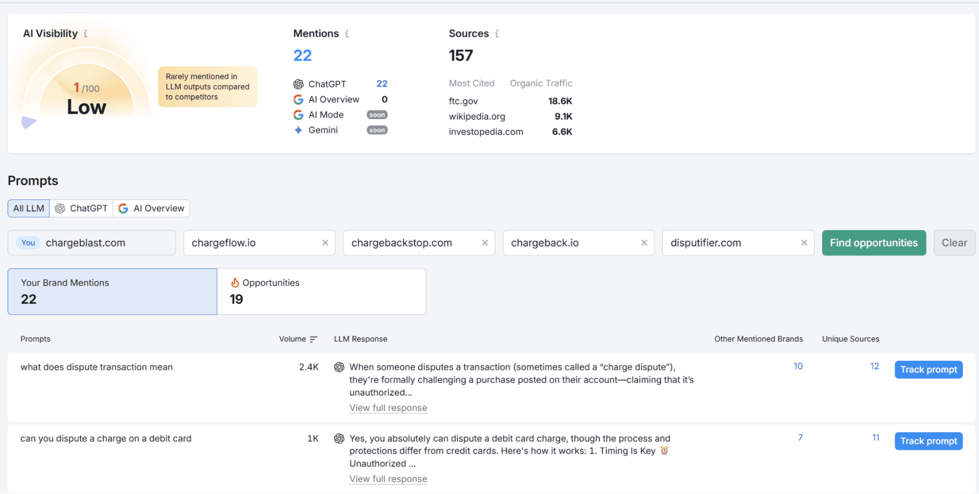 - AI brand mentions: Track how often AI tools mention your brand versus competitors when users ask relevant questions using tools like Semrush’s AI SEO Toolkit.