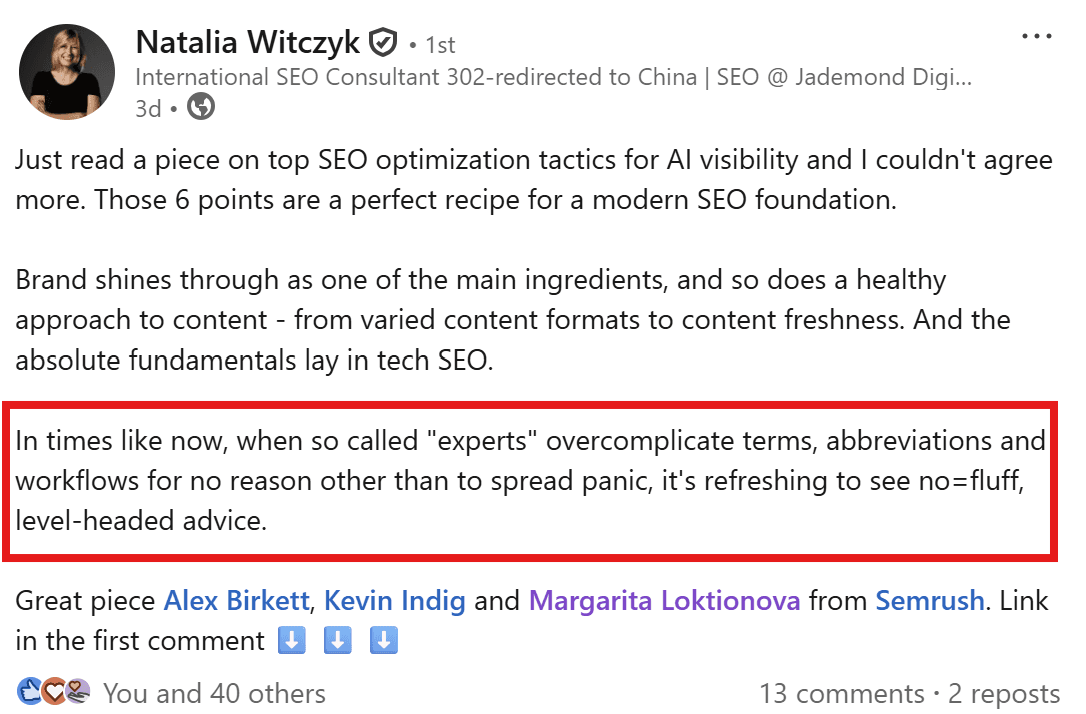 In this post, Natalia reshared a recent article with AI visibility tips: