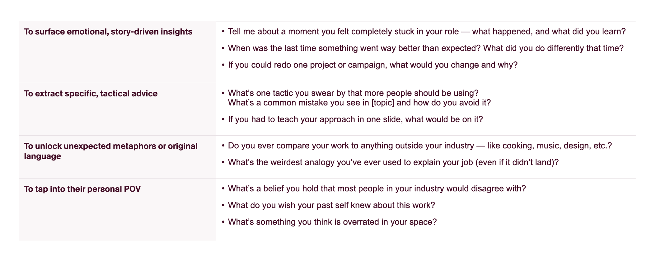 - Tailor your prompts. Look for something distinctive in their background — a LinkedIn post, hobby, or past role — and connect it to your topic. Find a hobby or unique trait (e.g., a CMO who speaks four languages) and use it to draw a metaphor that gets them thinking differently.