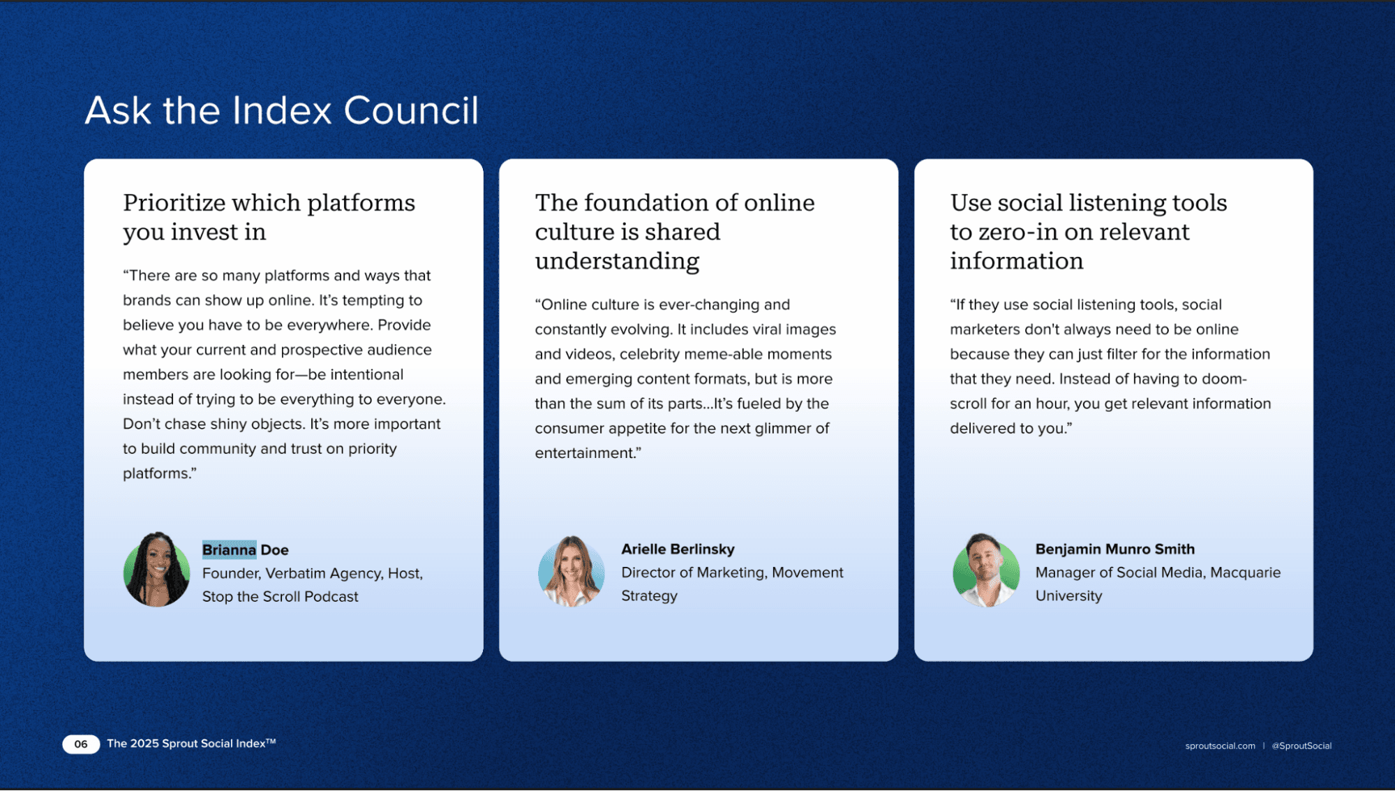 Or look at this snippet from Sprout Social’s 2025 Index report, where each SME quote is treated like a standalone card — snackable, screenshot-friendly, and plug-and-play for launch kits and carousels.