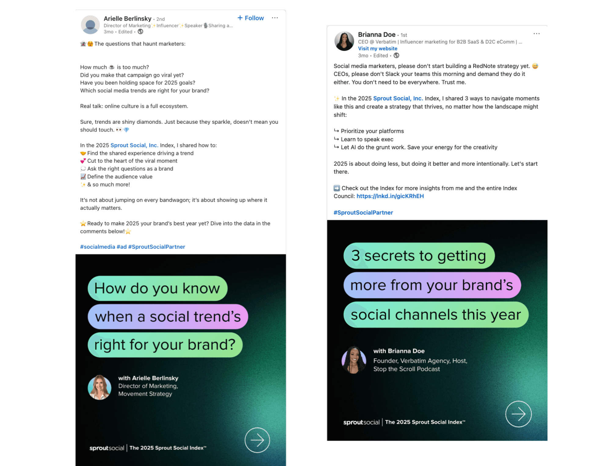 Look at the 2025 Sprout Social Index launch. Instead of a single brand announcement, contributors like Brianna Doe and Arielle Berlinsky shared carousel posts with Sprout-branded designs that highlighted their own insights from the report.