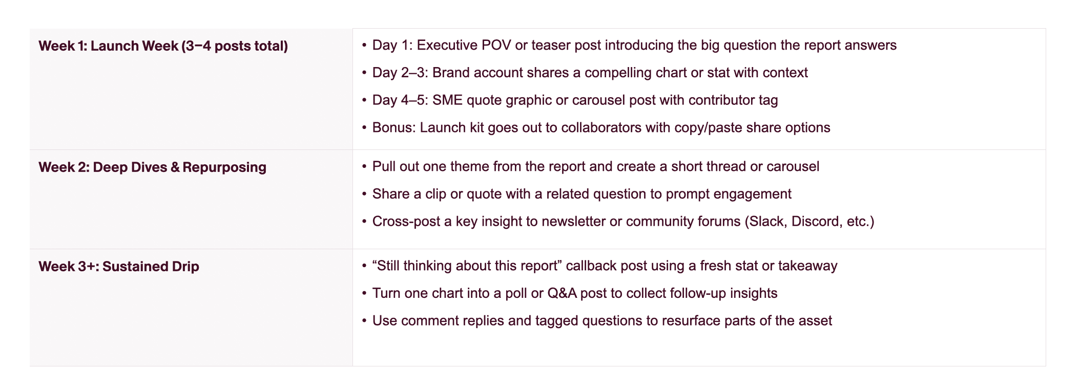 Front-load the first two weeks, then taper into lighter touch reminders. That keeps the report top of mind without fatiguing your feed or letting it fizzle too early.