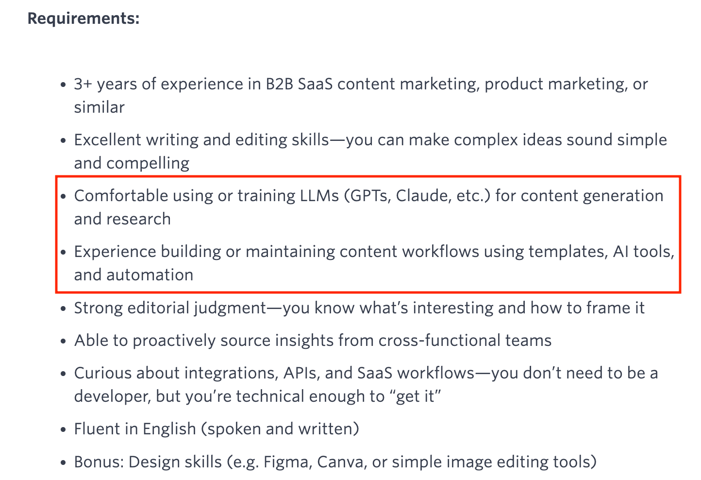 It’s also reflected in modern content job descriptions, which typically require skills in AI and building workflows: