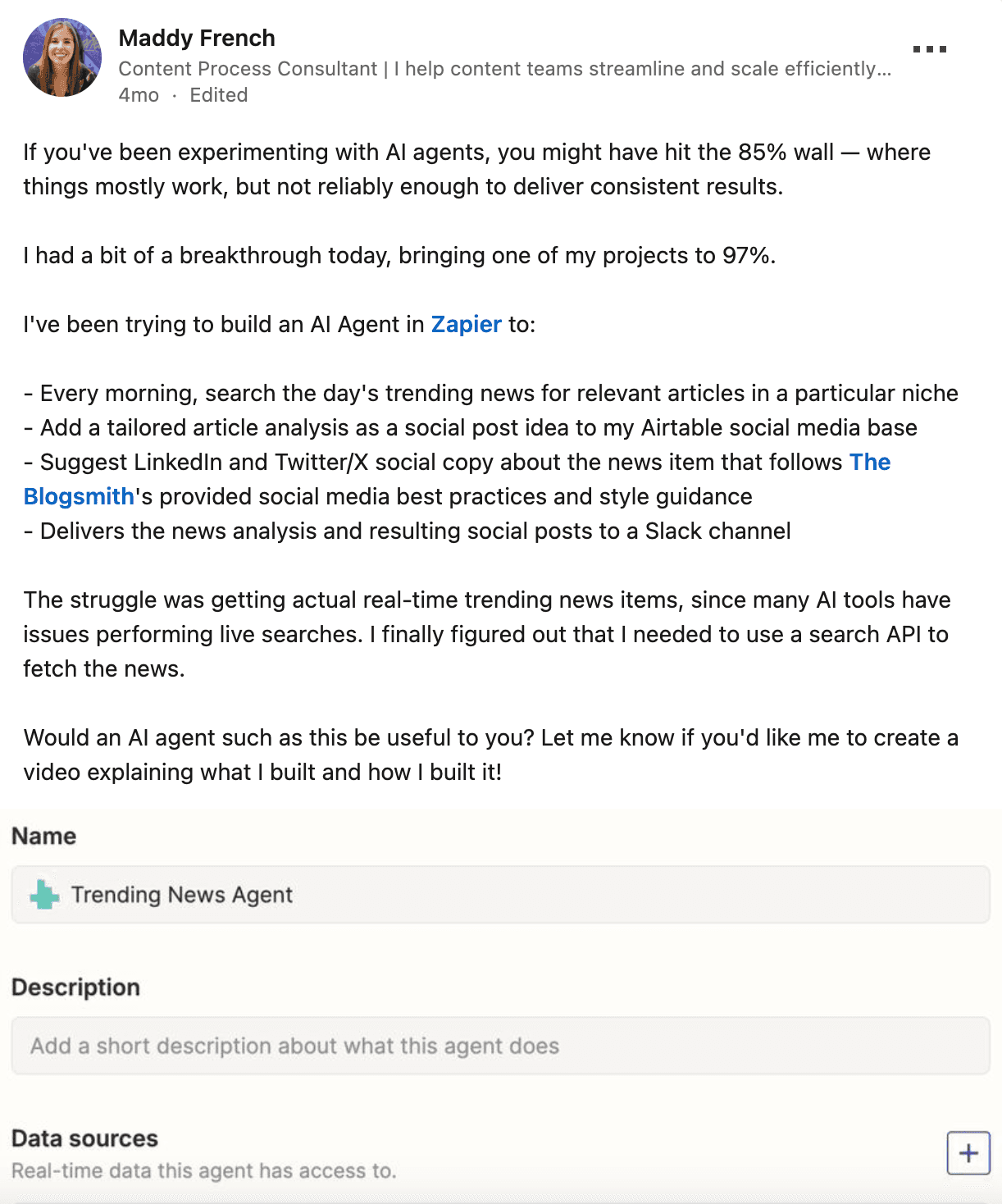For example, Maddy built a Zapier agent that searches for trending industry news each morning, analyzes relevant articles, and generates brand-compliant social posts delivered straight to her team's Slack channel.