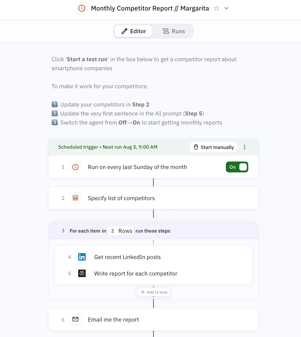For example, this agent runs on a scheduled trigger and sends competitive analysis updates straight to my inbox: