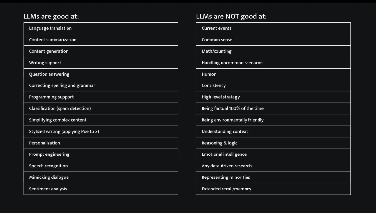 This table from Britney Muller's "Actionable AI for Marketers" course provides a clear guide for where AI can help — and where it falls short: