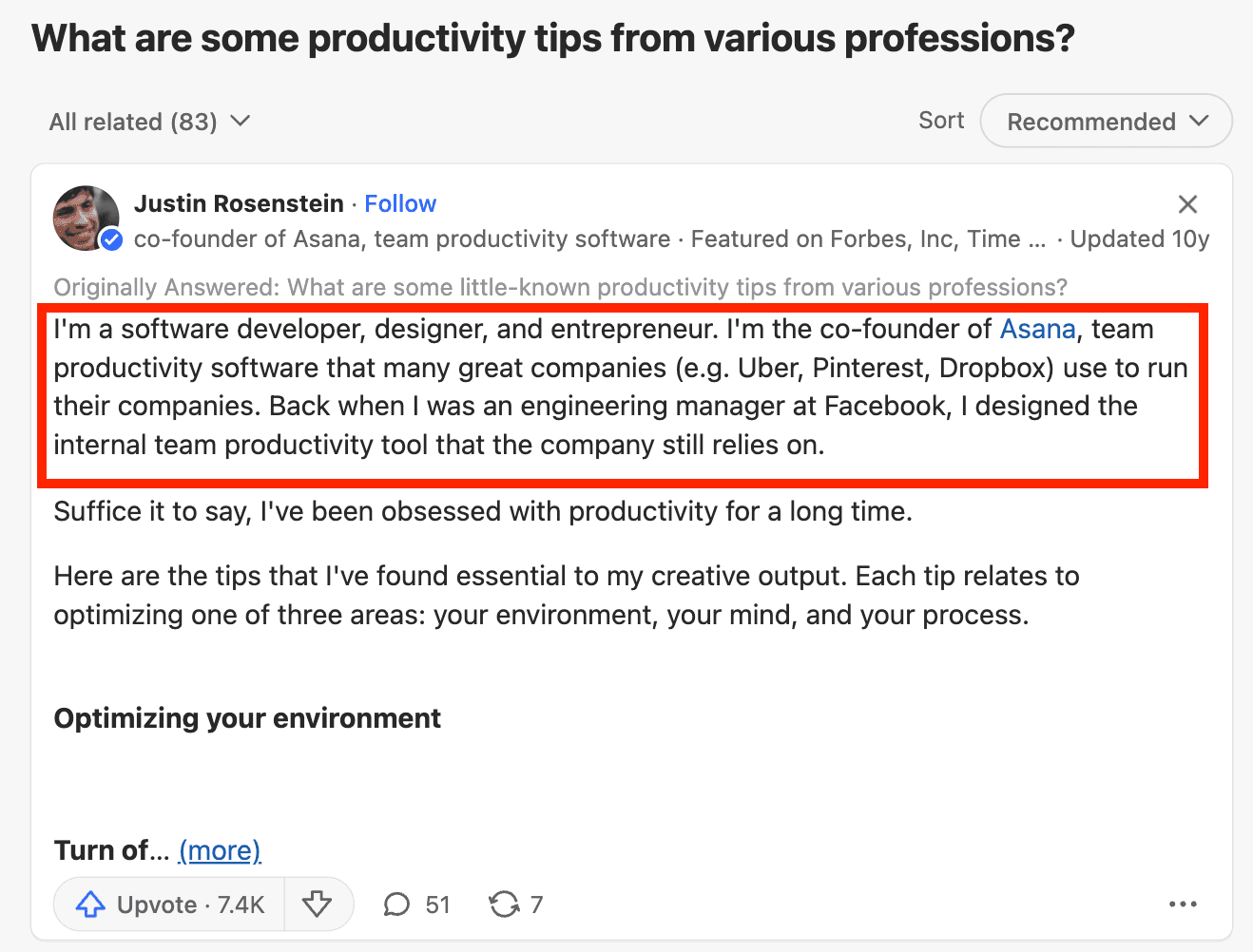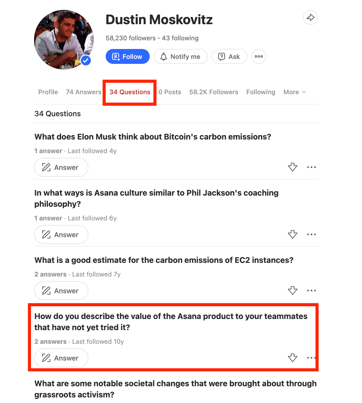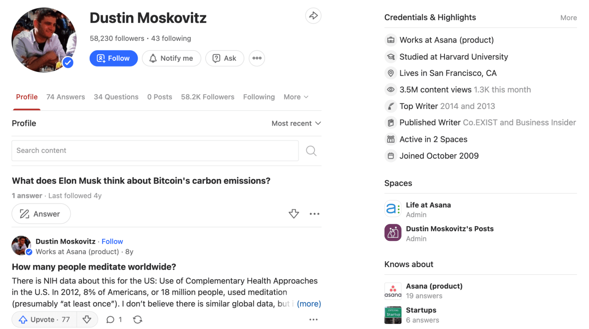 For example, Dustin Moskovitz, CEO of Asana, has a very active presence on Quora with over 58,000 followers.