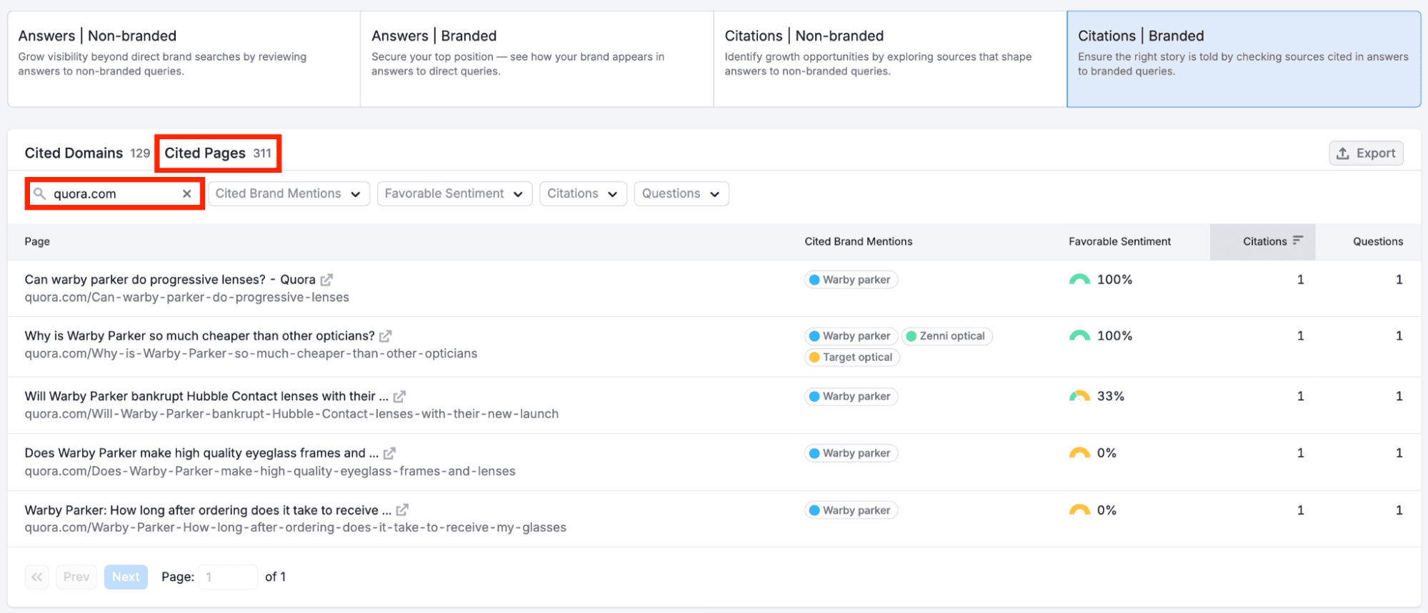 From here, select "Cited Pages" and enter "quora.com" to filter specifically for Quora citations.
