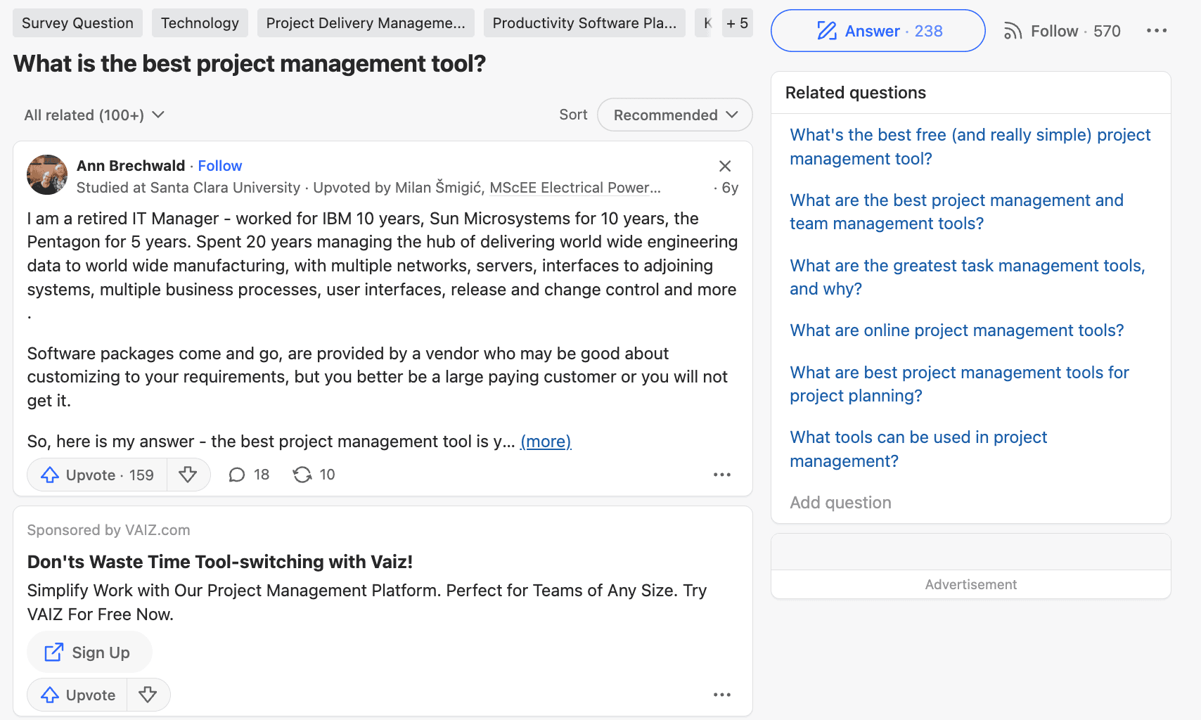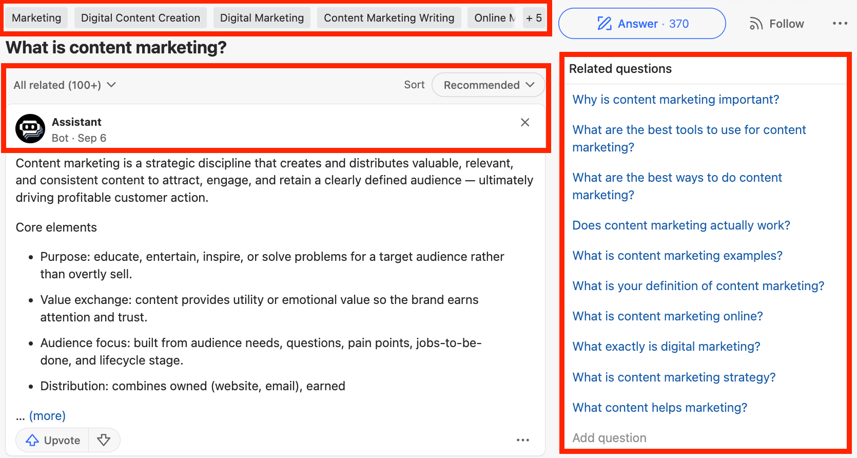When you visit any question page, you'll notice topic tags above the question (like "Marketing" or "Digital Marketing") and related questions in the sidebar.