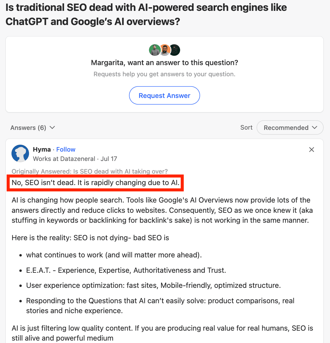 I then sat down with Quora's team to understand what makes certain content more likely to appear in AI results and get featured by the platform’s algorithm.