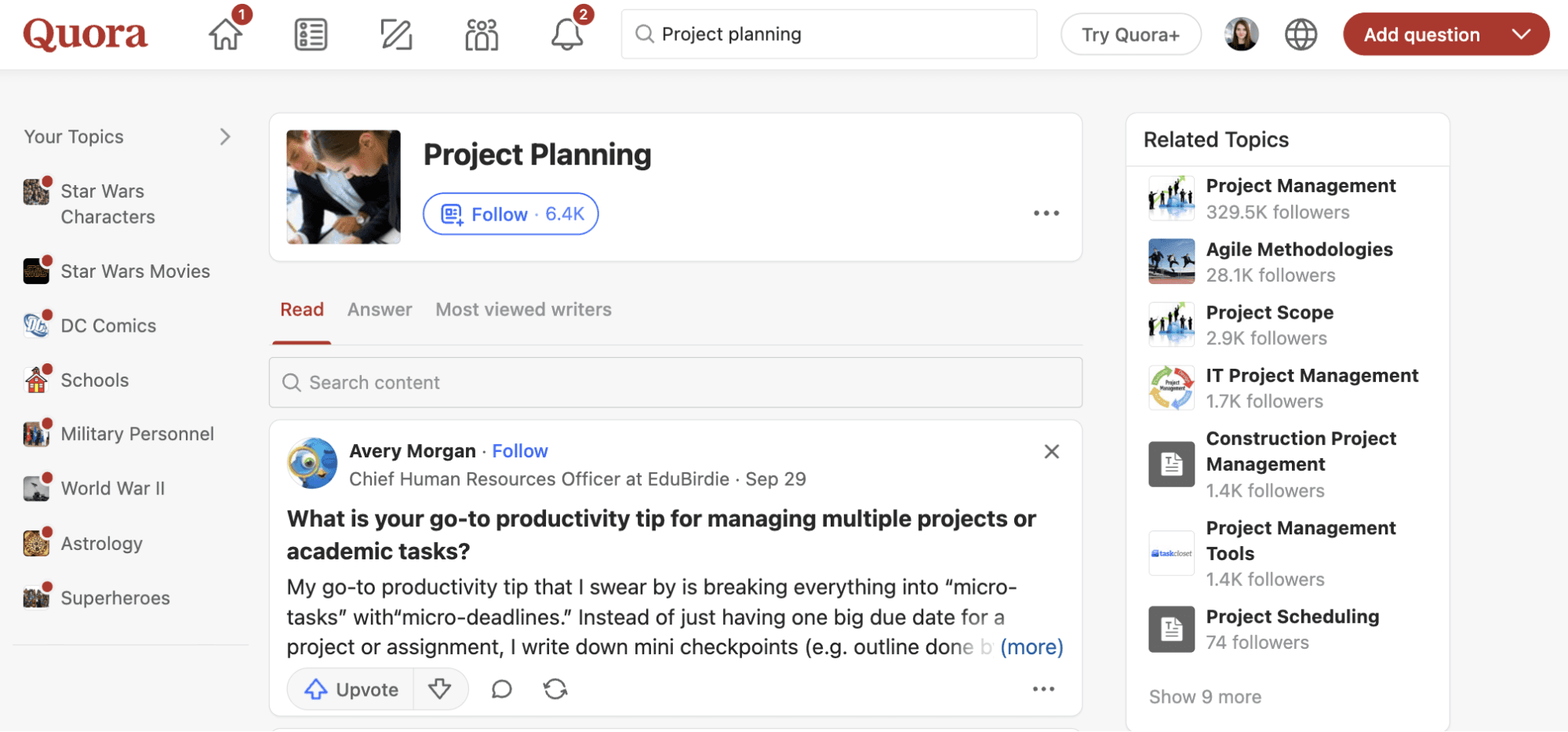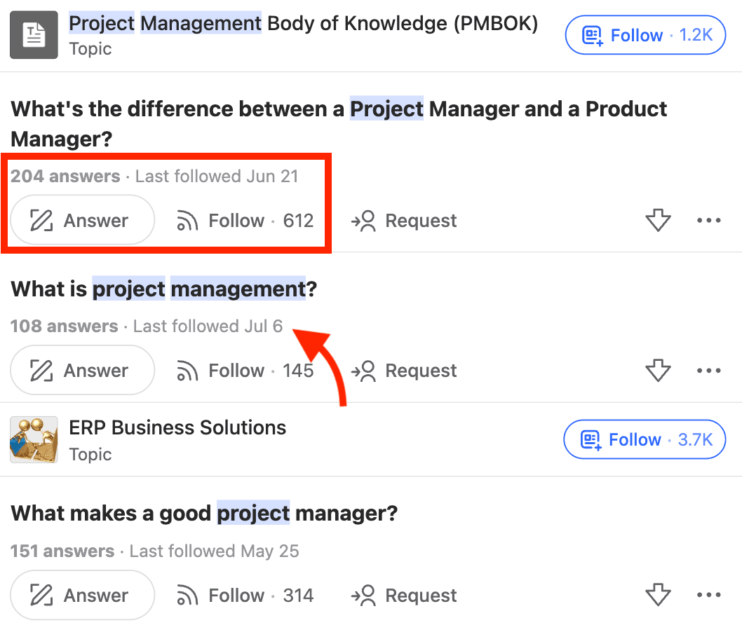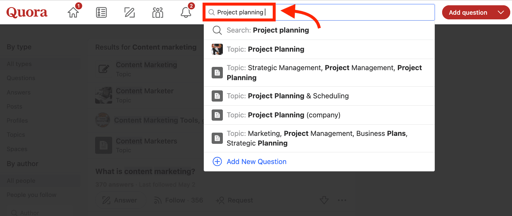 Use Quora's search bar to explore topics related to your industry. Type general terms like "project planning" to see what topics exist.