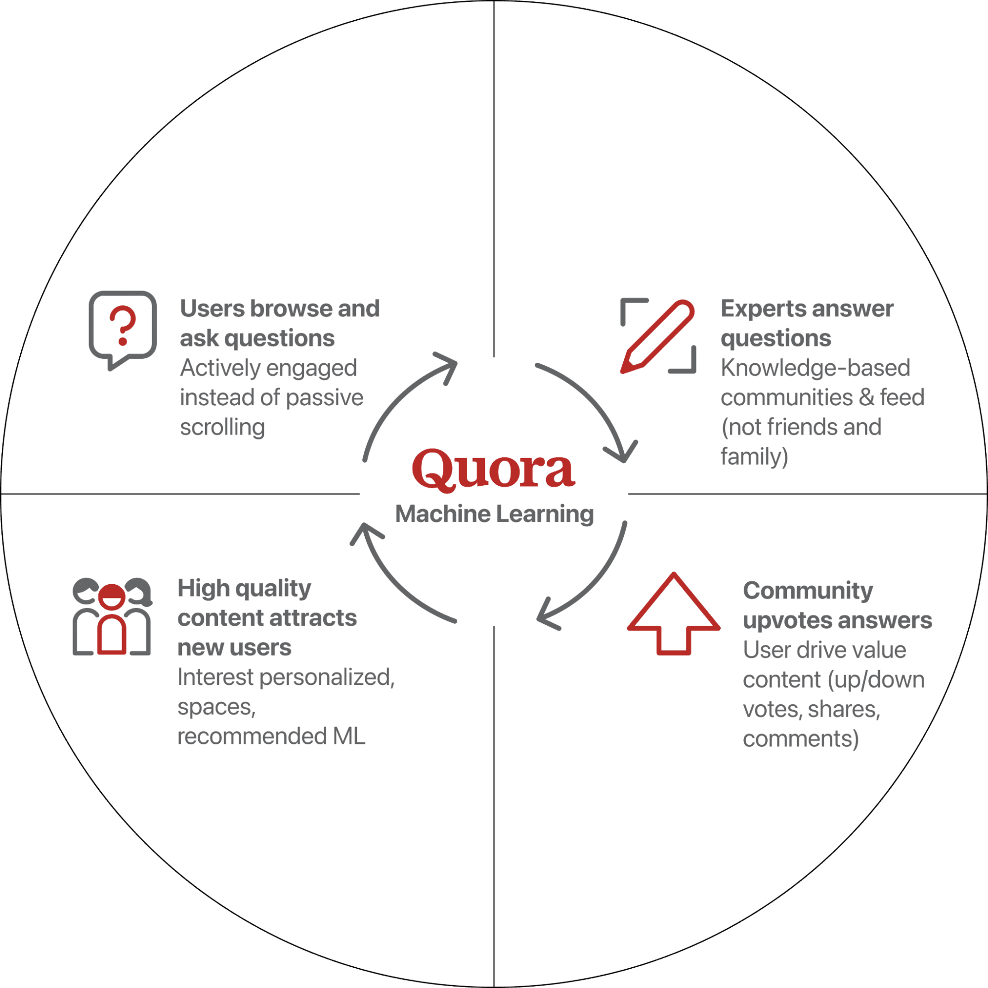 Quora is a question-and-answer platform where users ask questions, provide answers, and engage with content through upvotes, comments, and shares.