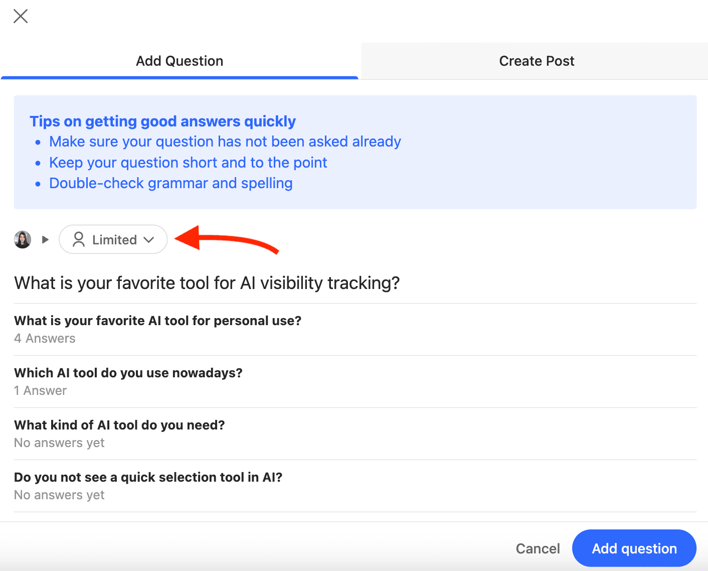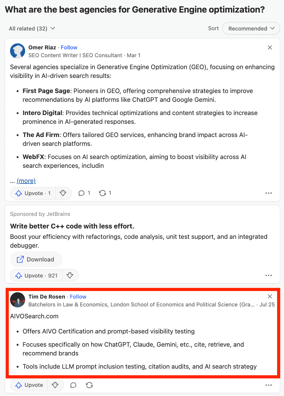 For example, questions with recent activity typically offer better visibility, while threads with increased engagement tend to be prioritized by AI (as we’ve seen in the research).