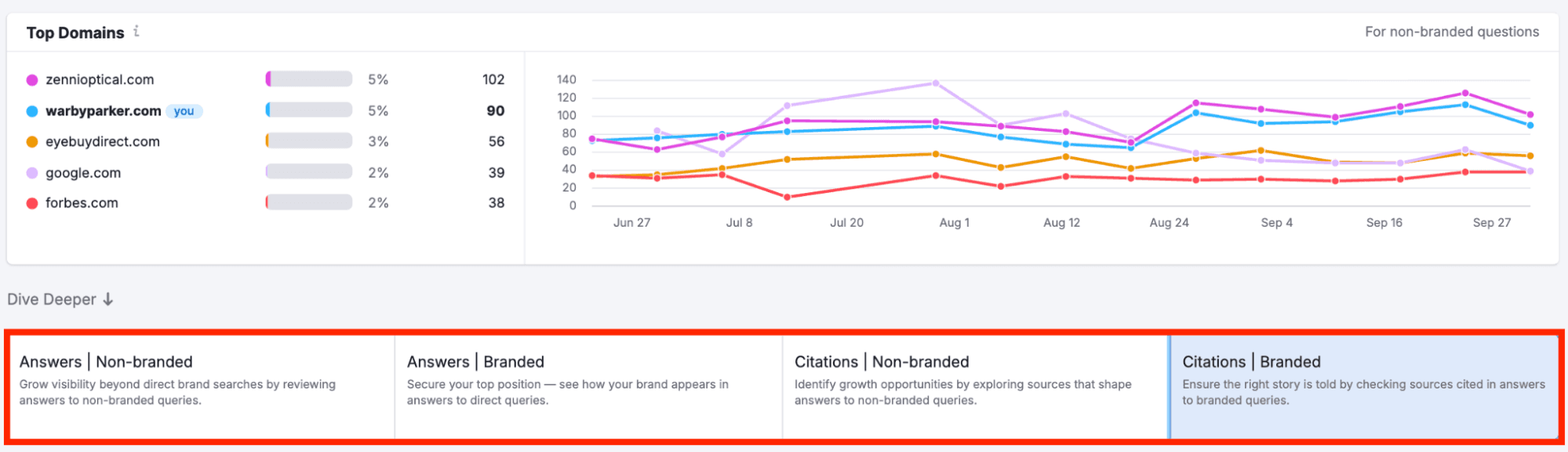 Then, navigate to "Narrative Drivers,” scroll to "Citations," and choose between branded or non-branded queries.