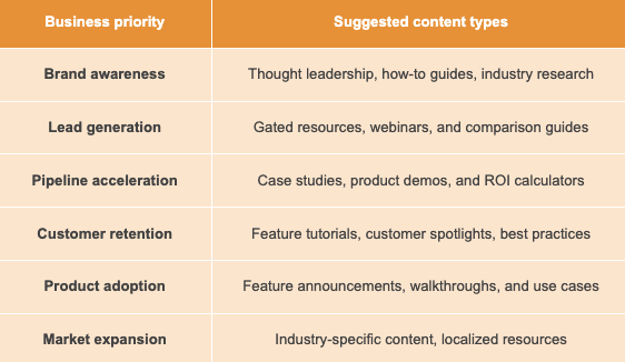 Start with company OKRs. Make sure your content goals ladder up to those priorities each quarter. If leadership pivots, adjust your roadmap so your content mix matches where the business is heading.