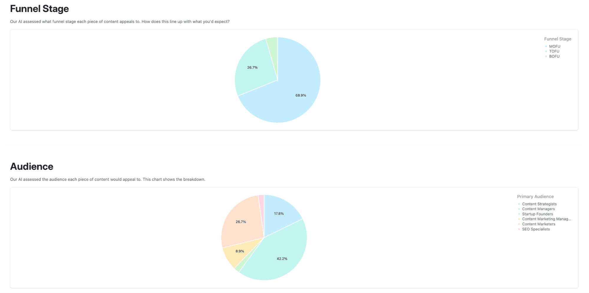 Here’s what an audit of our content library at Relato looks like with Demand Genius: it instantly shows us which funnel stages, audiences, and interests we’re serving (or missing), so we can decide what to refresh or retire without weeks of manual spreadsheet work.