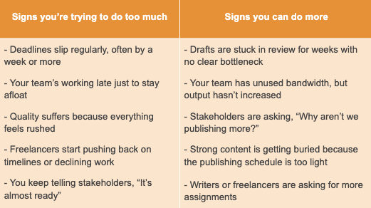 Your content strategy is only as strong as your team’s ability to execute it. If your plan calls for five blog posts a month but your writer can only deliver three without burning out, you’ve got a disconnect.