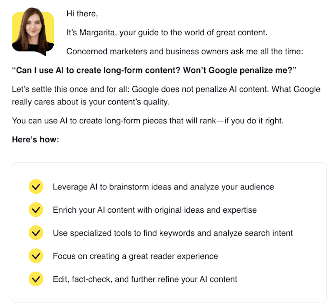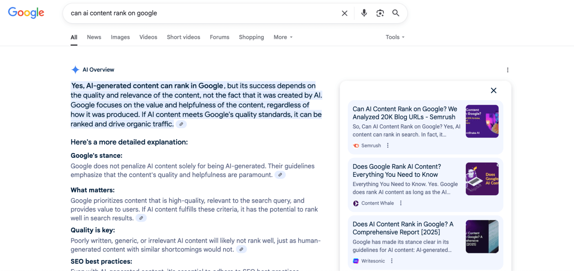For example, my research appeared first when I searched “Can AI content rank on Google?” This instantly established Semrush’s authority on the topic.