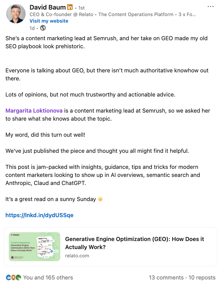 For example, David Baum’s post featuring my previous article for Relato got 165 likes and 13 comments — results that are often harder to achieve through the company page alone.