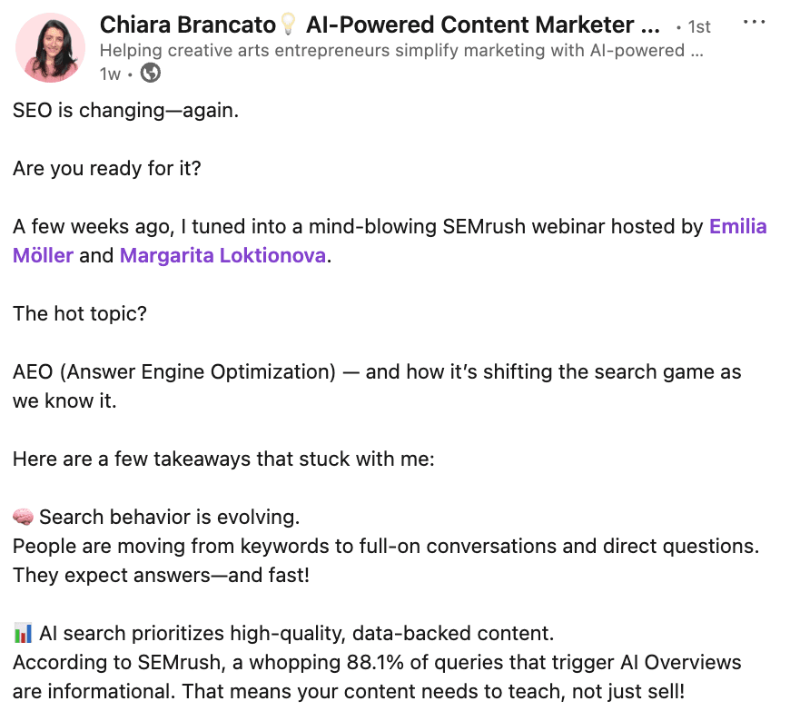 For example, our recent AI visibility webinar with Emilia Möller drew thousands of registrations and lots of social buzz.
