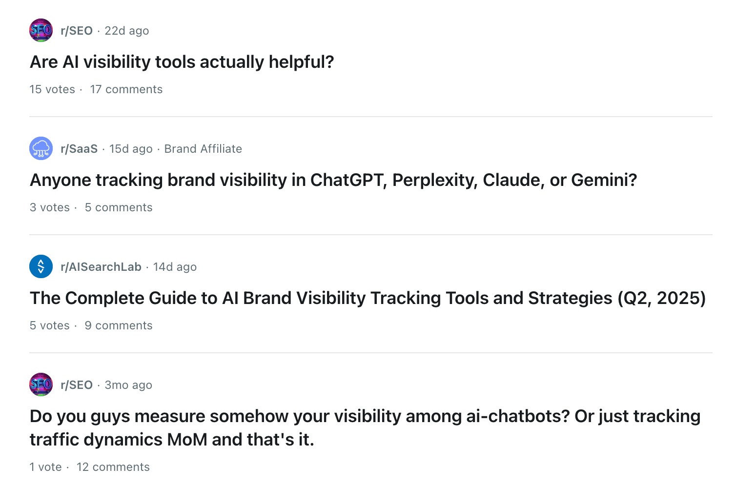 Simply searching “AI visibility tracking” on Reddit reveals specific questions people are asking about this topic.