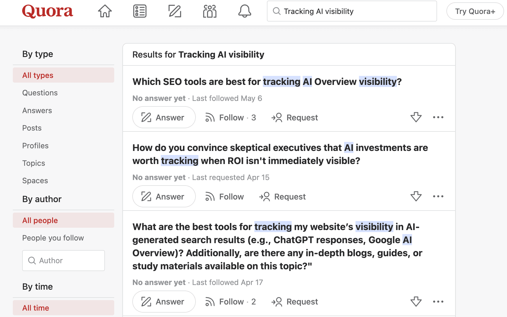For example, I’ve instantly found several unanswered questions related to AI visibility.
