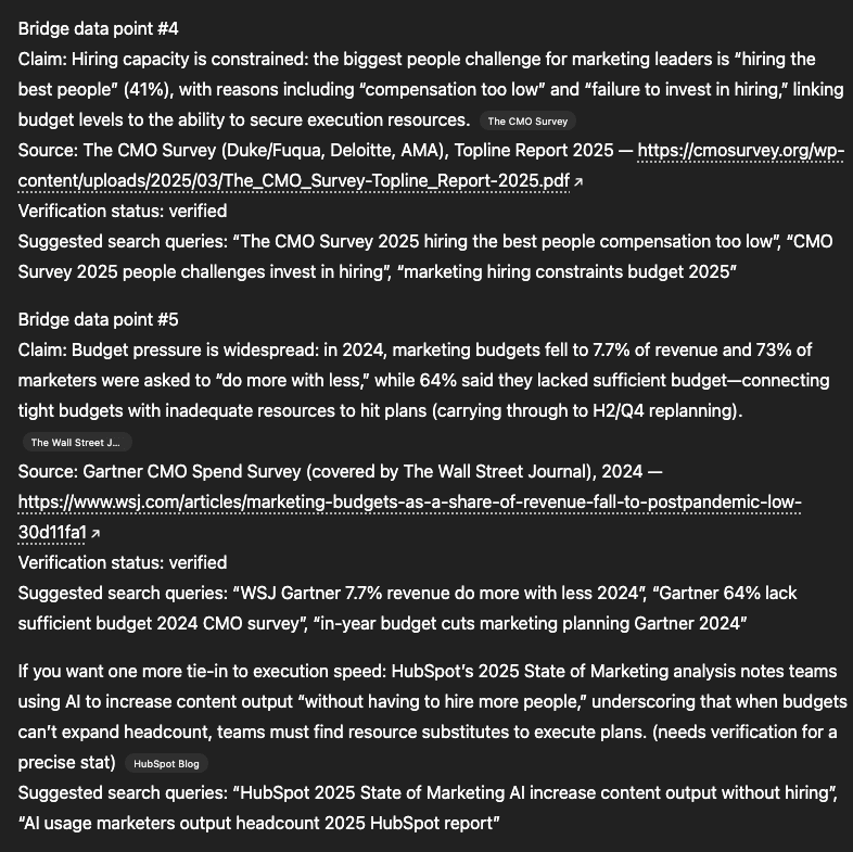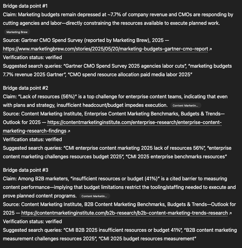 - Bridge data point #1Claim: …Source: …Verification status: [verified / needs verification]Suggested search queries: …