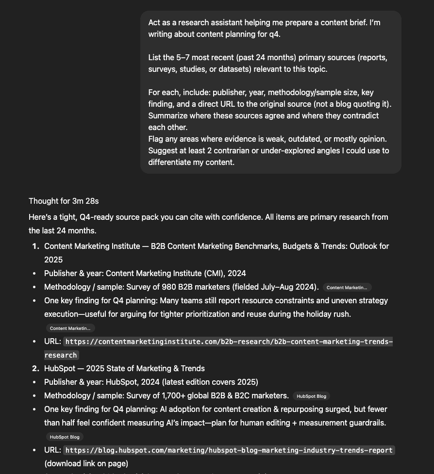 Warning: You probably don’t need me to tell you this, but — AI is great at surfacing sources, but it’s also notorious for fabricating citations or linking to summaries instead of the original report. Always click through, check the publisher, and verify the data trail yourself. Think of the prompt as a way to save time finding leads, not a replacement for your own judgment.